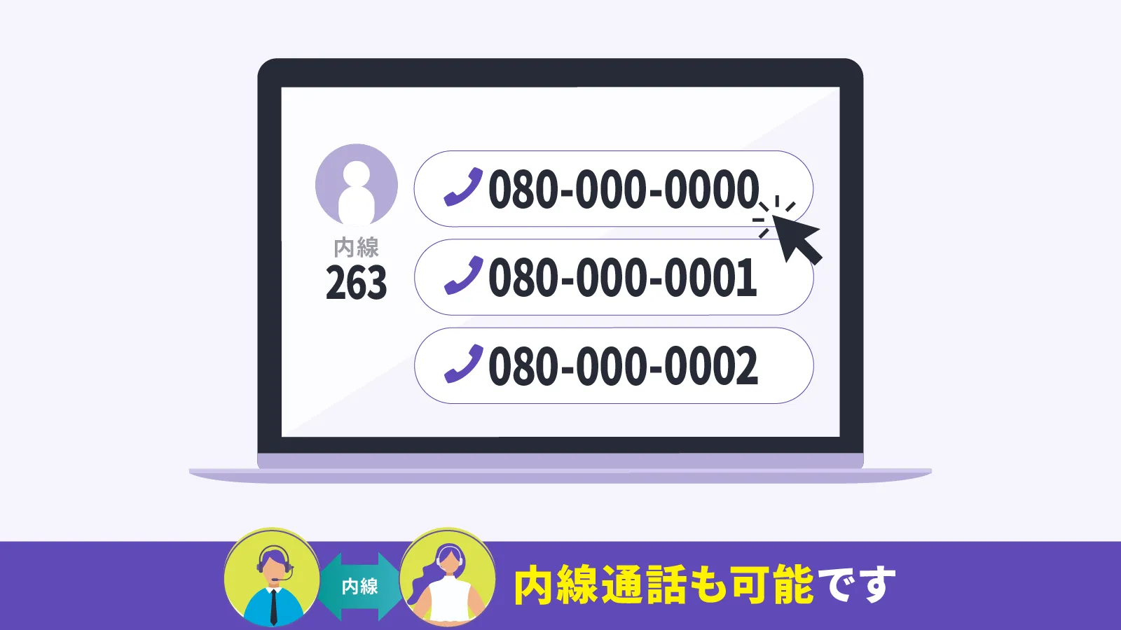 内線ごとに指定の電話番号で発信できるように管理画面から設定でき、内線同士での無料通話も可能です。