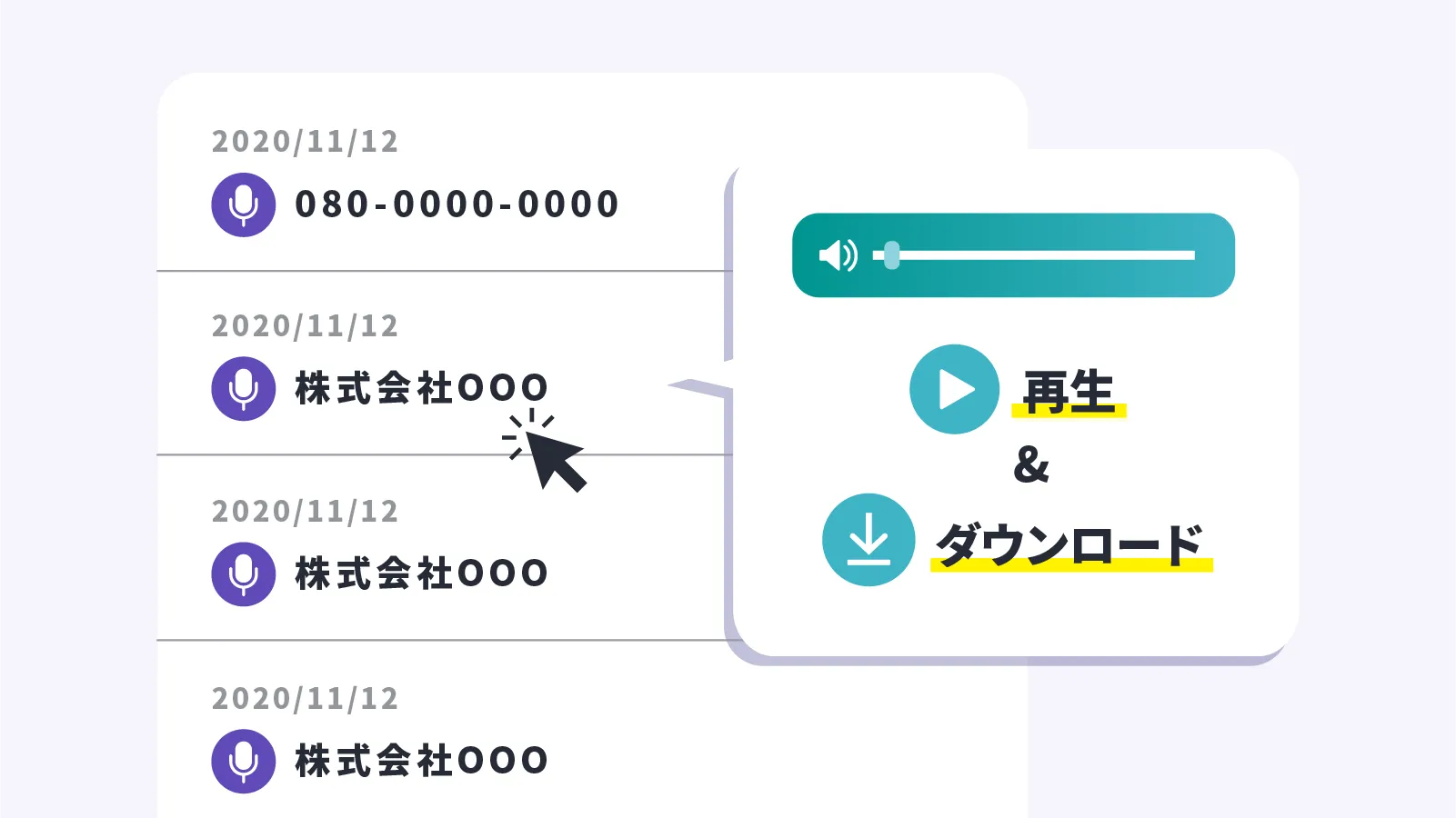 発信通話も着信通話も自動で録音が残ります。録音ファイルはWEB管理画面の通話履歴から再生ができ、ダウンロードも可能です。録音を録る録らないは電話番号ごとに変更することができ、再生可否も権限に応じて設定することができます。