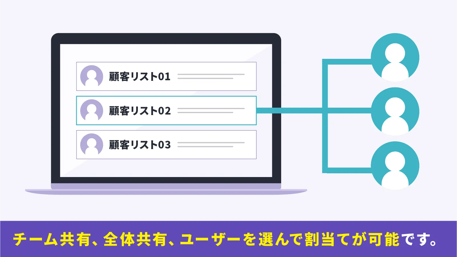 共有・割当顧客リストはCSVでインポートやエクスポート、手入力での登録ができます。投入したリストはチーム共有、全体共有、ユーザーを選んで割当て可能です。