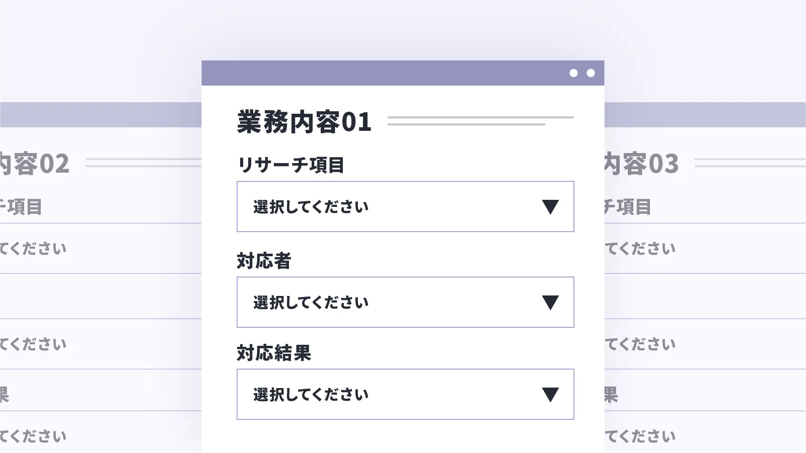 業務複数を作成し、業務別のリサーチ項目、対応者フラグ、対応結果フラグを作成しリストごとに業務を分けられるので、同時に複数業務に対応可能です。