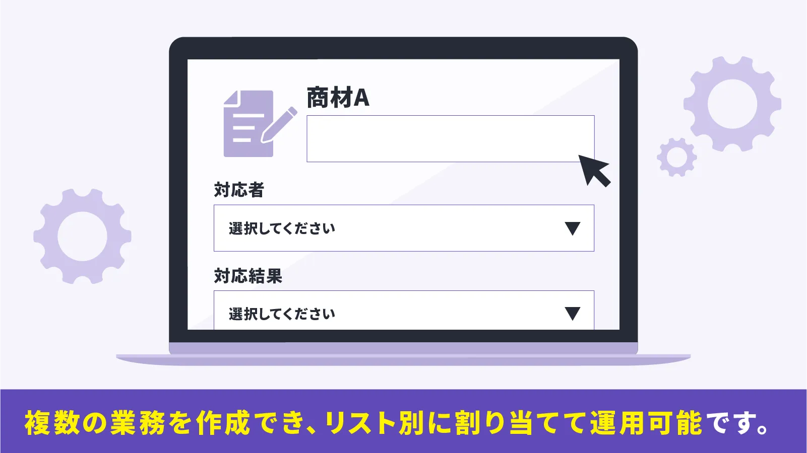 顧客情報の入力欄や対応者、対応結果フラグなどを業務に合わせてカスタマイズできます。複数の業務を作成でき、リスト別に業務を割り当てて運用可能です。