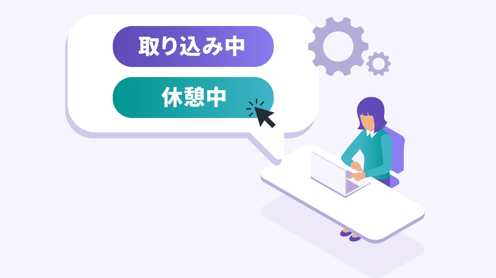 ユーザーは取込み中や休憩中などの自身の稼動ステータスを解除時間を決めて設定でき、設定ステータスはモニタリング画面に反映され、メールやチャットで通知されるので稼働状況の周知が可能です。