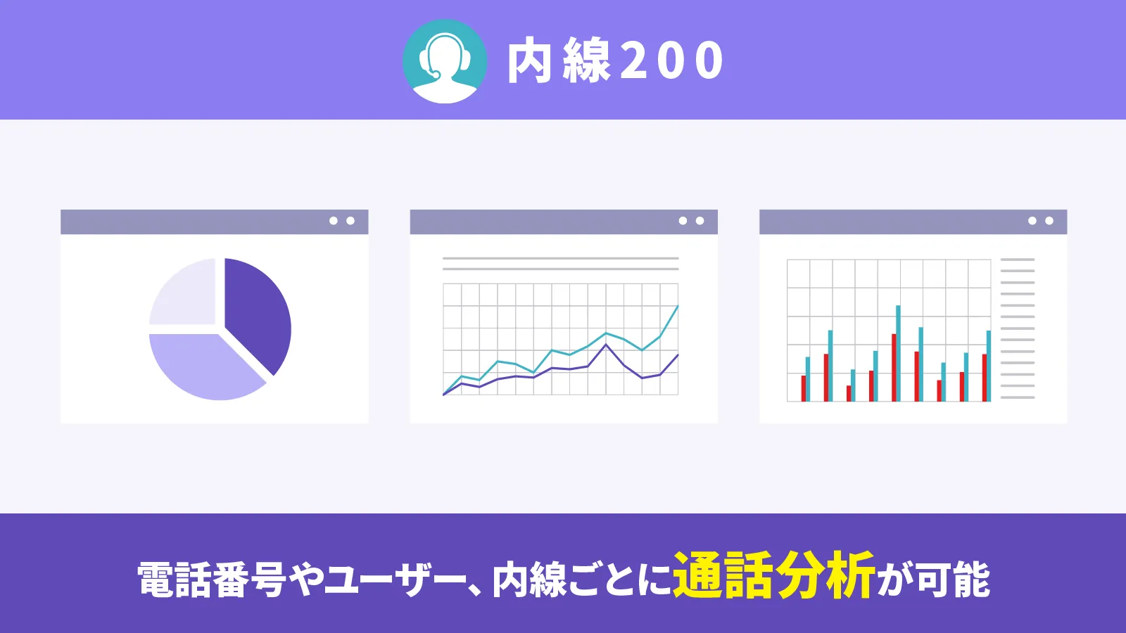 電話番号やユーザー、内線ごとに発着信回数、通話数、通信時間・通話率をグラフと表で表示します。通話混雑時間やあふれ呼の確認、着信から受電までの時間の確認、電話番号ごとのコールトラッキングにも活用可能です。