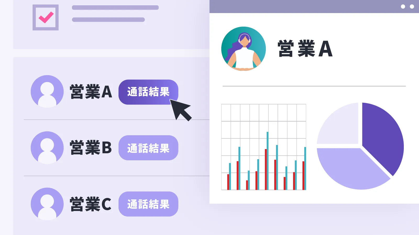 通話結果の数と比率を条件指定したリストやユーザーごとに表示できます。