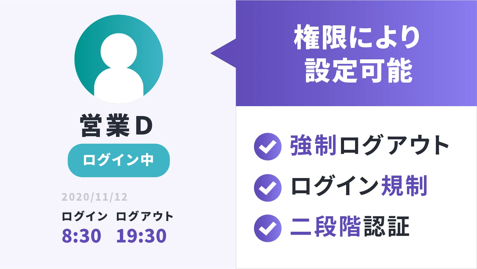 ログイン・ログアウト時間を履歴として管理できます。またリアルタイムのログイン状態も確認でき、権限により他ユーザーの強制ログアウトや曜日や時間帯に応じたログイン規制や二段階認証ログインも設定可能です。
